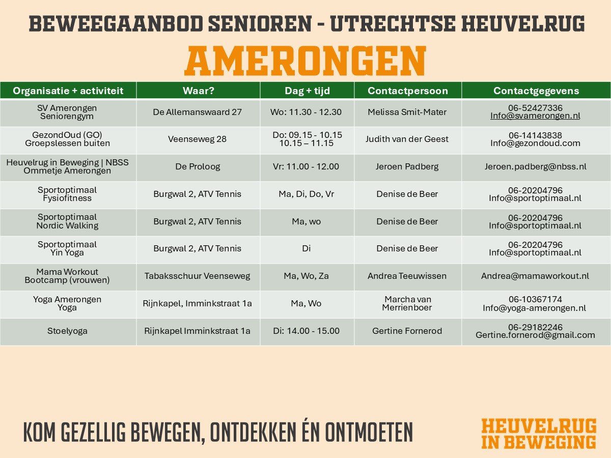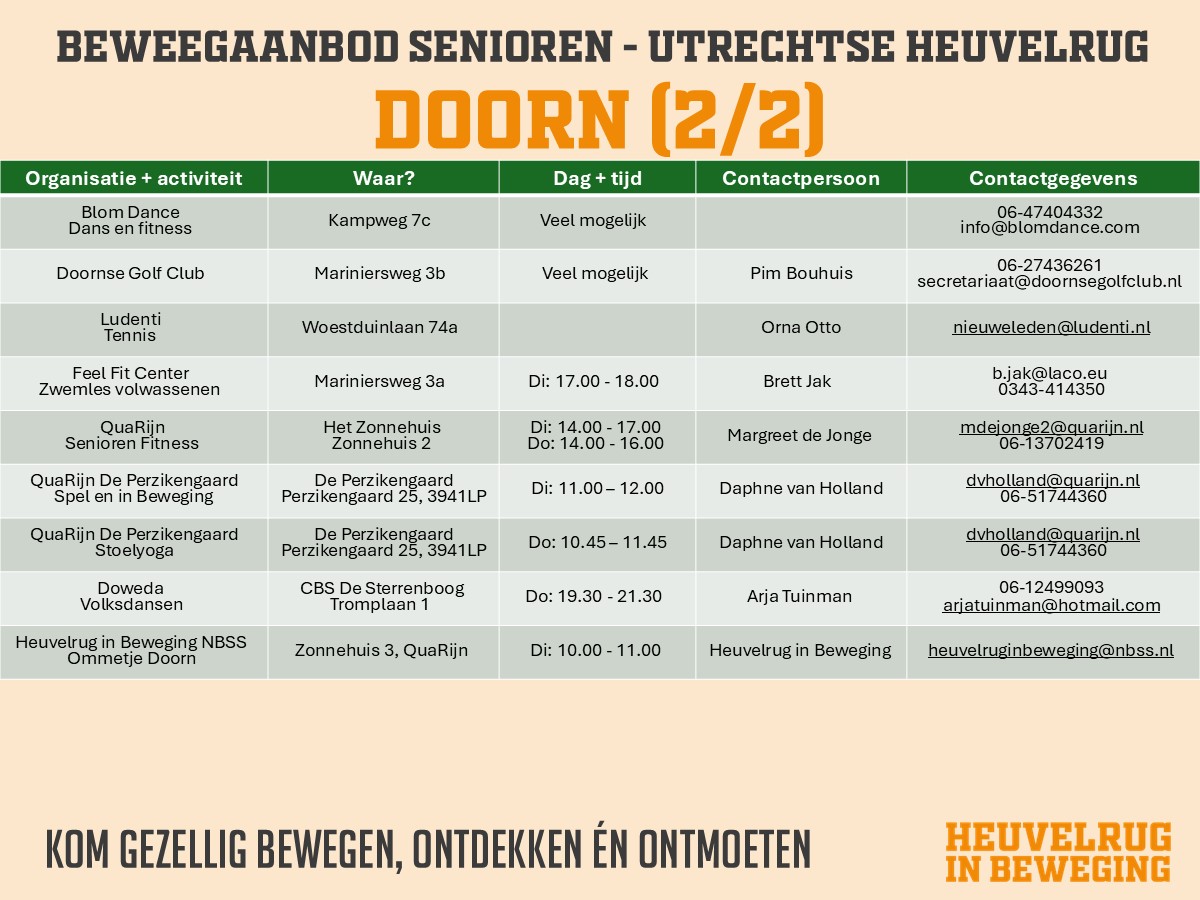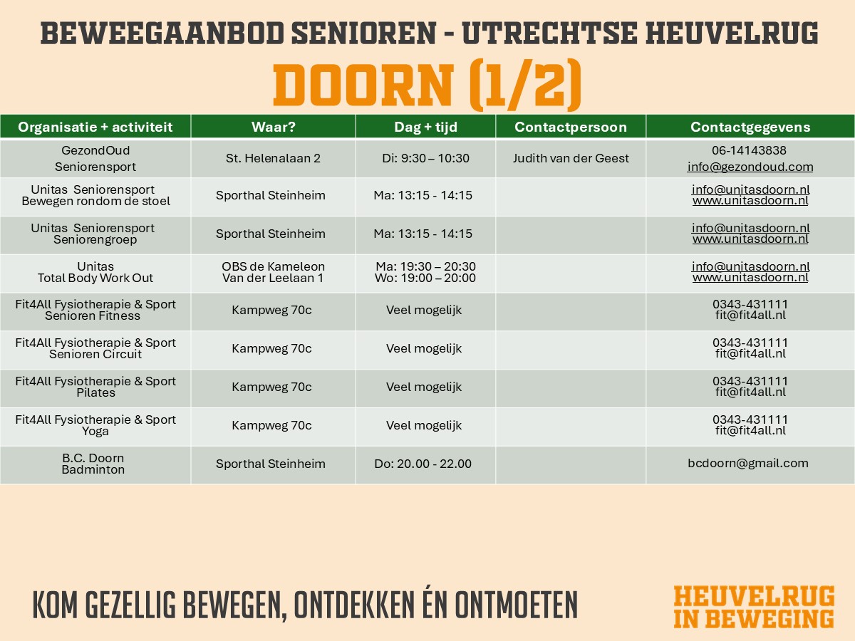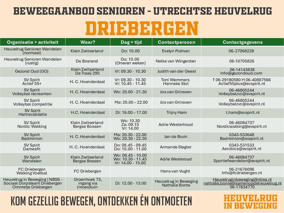 Op deze pagina vindt u de activiteitenoverzichten dat binnen de verschillende dorpen van de Utrechtse Heuvelrug op sport- en beweeggebied aangeboden wordt.