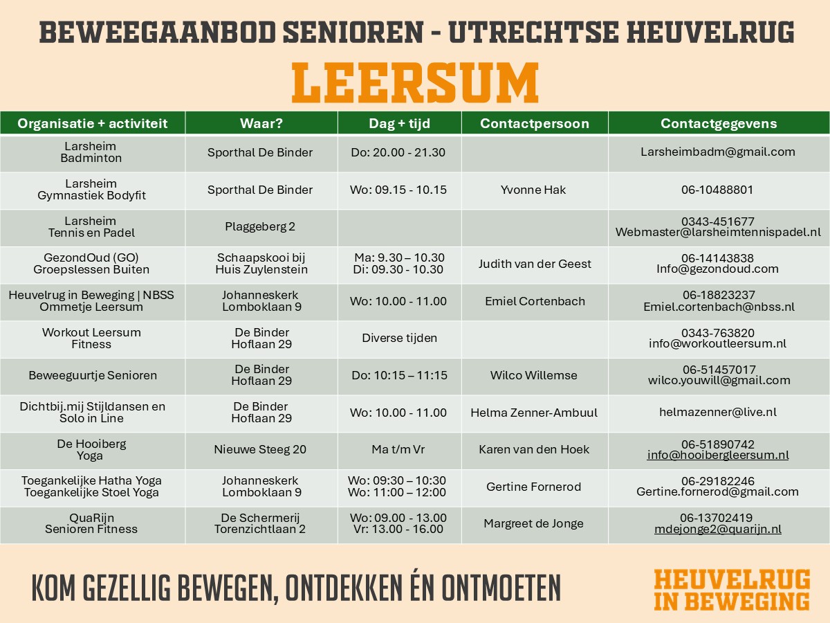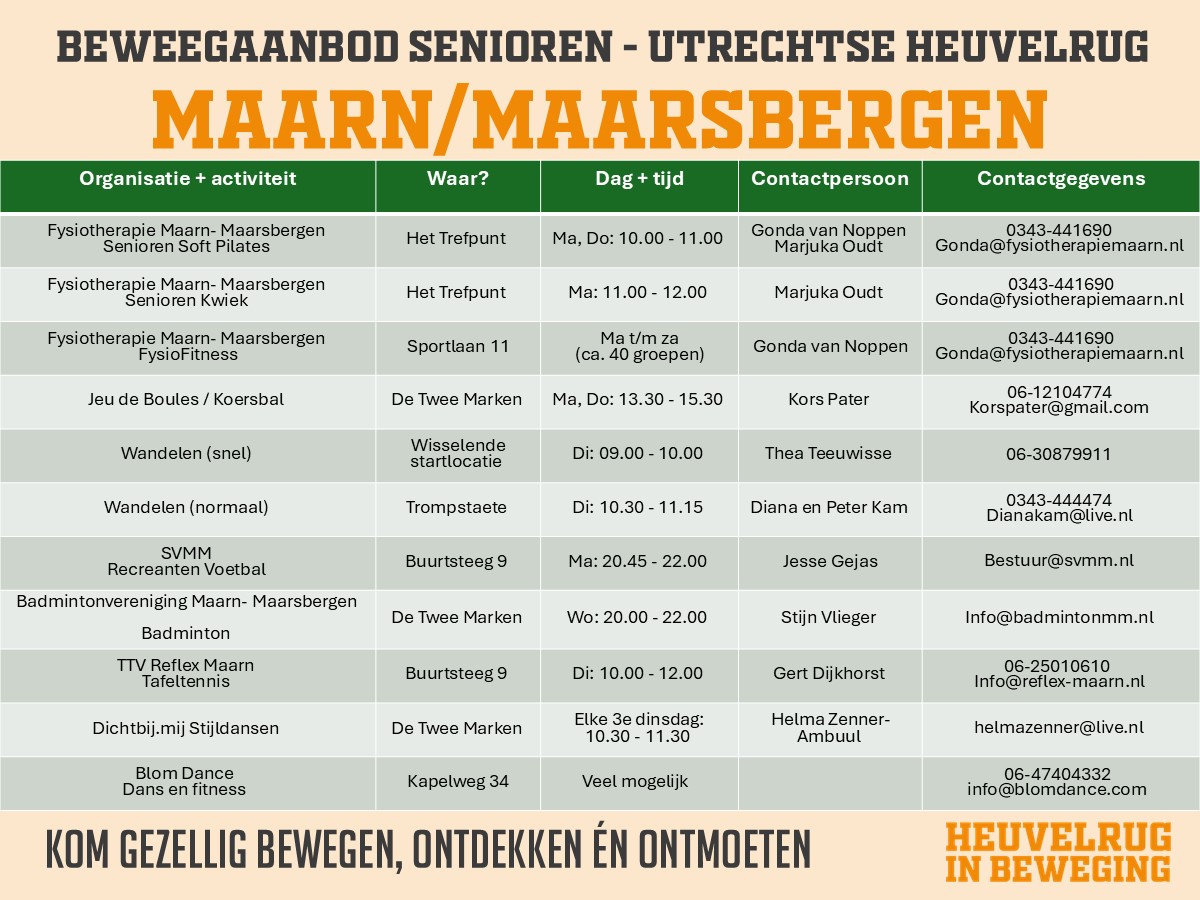 Weet of heeft u een sport- beweegactiviteit die hier niet vermeld staat? Geef het aan en mail naar heuvelruginbeweging@nbss.nl dan proberen wij het zo snel mogelijk toe te voegen.