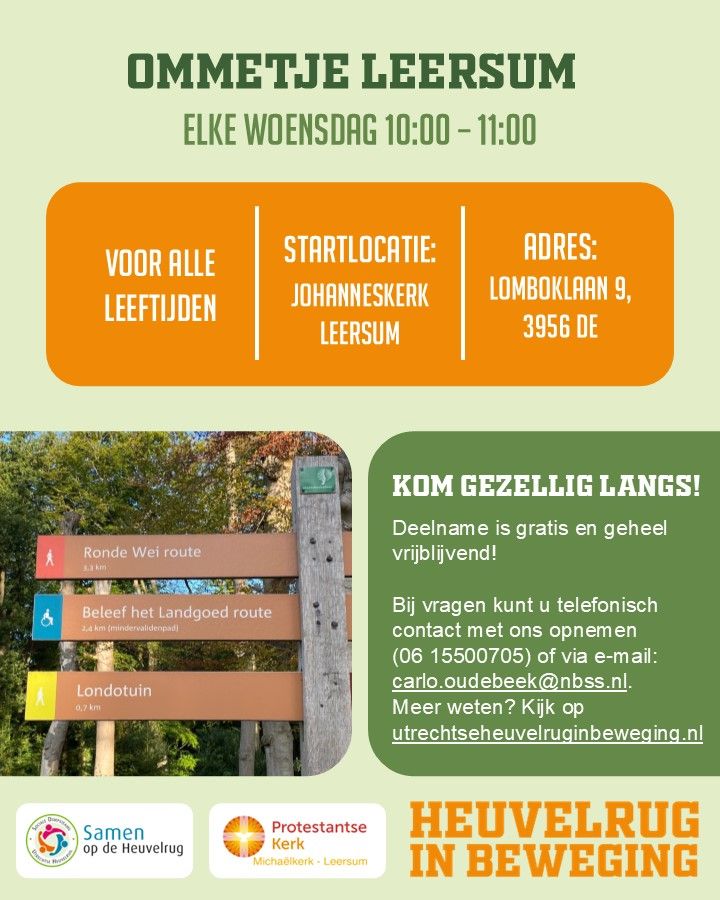 In Leersum is het ommetje in augustus gestart met 7 deelnemers en dit liep al snel uit naar een wekelijkse deelname van 15 tot 20 deelnemers. Ondanks dat de groep nog niet heel lang samen wandelt is nu al te merken dat het sociale aspect hoog in het vaandel staat. Vanaf de Johanneskerk in Leersum start de groep op woensdagen om 10:00 het ommetje van 50 tot 60 minuten waarna er afgesloten wordt met een bakje koffie of thee in de Johanneskerk. Met dank aan de vrijwilligers wordt de groep wekelijks weer goed voorzien!